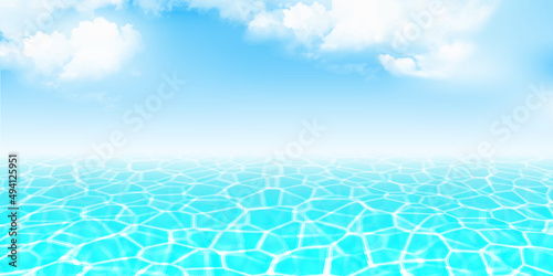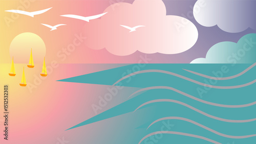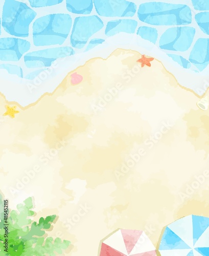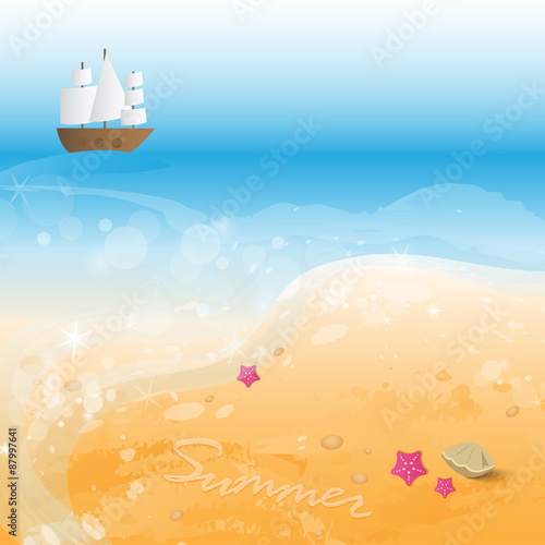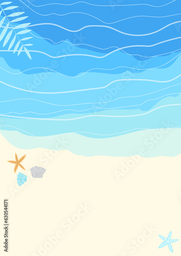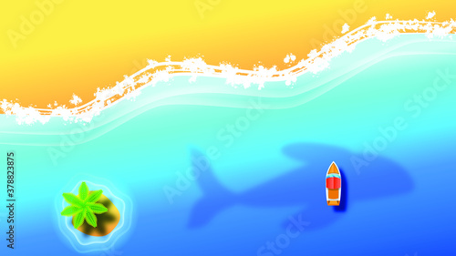 Мультяшная векторная иллюстрация с видом сверху на пляж тропического острова. Морская волна и яхта, песчаный берег с туристическими зонтиками, панорамный дизайн с воздуха. Путешествие на отдых на туристическом курорте