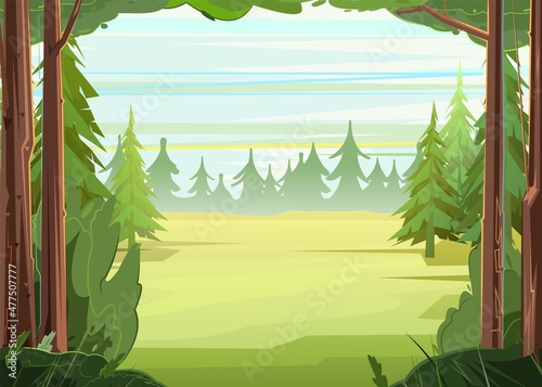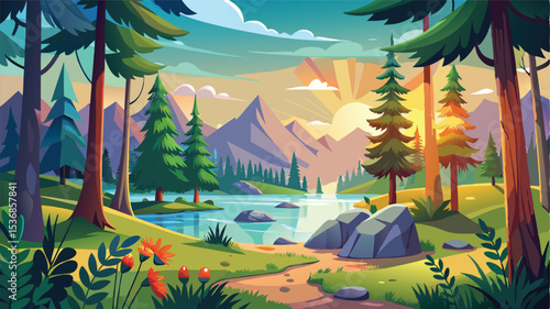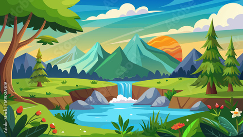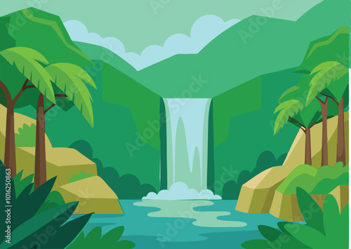Пейзаж тропических джунглей, векторная иллюстрация в стиле бумажного искусства. Пейзаж леса Амазонки с зеленой листвой, экзотическими растениями, водопадом.