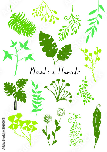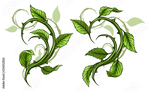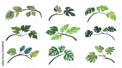Набор декоративных элементов тропической лианы, плоская векторная иллюстрация, изолированная на белом фоне. Свисающие ветви виноградной лозы джунглей, вьющиеся зеленые растения, каркас монстеры.