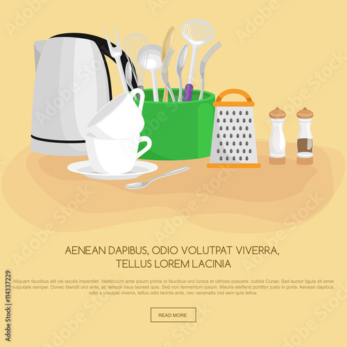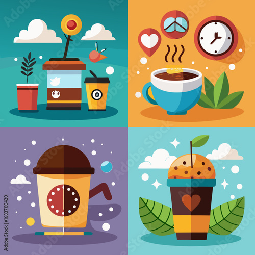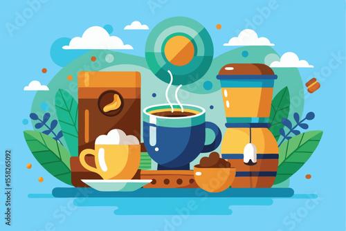 Векторная плоская иллюстрация производства кофе. Горшочек с турецкой джезвой, ручная накидка крышки на стеклянный кувшин, кофемолка, чашка горячего напитка, круассан. Оборудование и аксессуары для приготовления кофе по-турецки плакат, баннер.