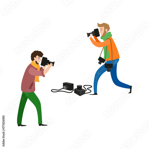 Тележурналист или репортер женского пола, говорящий с микрофоном перед оператором, записывающим прямые новости на улице, плоская векторная иллюстрация. Журналистика, средства массовой информации, трансляция горячих новостей.