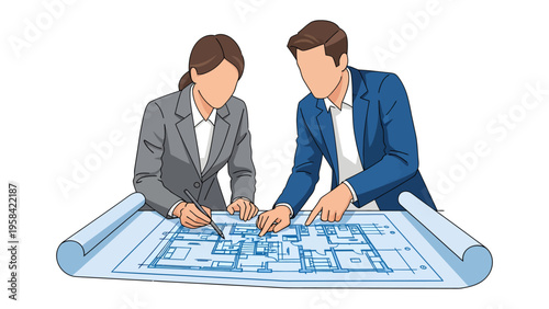 Два архитектора рисуют проект нового здания. Векторная иллюстрация концепции строительства. Планирование архитектурных проектов, разработка и строительство. Профессиональные услуги инженера-строителя.