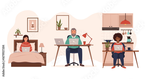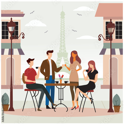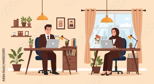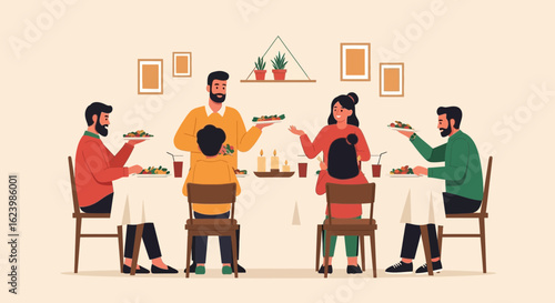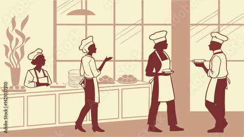 Два парикмахера делают стрижку клиентам в парикмахерской, векторная иллюстрация. Дизайн интерьера парикмахерской со стульями, зеркалами. Парикмахер стрижет волосы, делает мужские прически, бреет бороду.