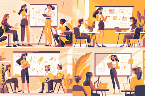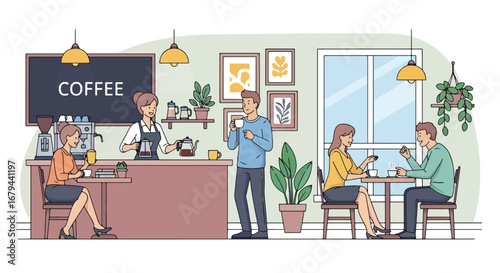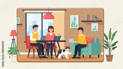 Двухэтажный коворкинг бизнес-офисный центр, плоская векторная иллюстрация. Современный интерьер коворкинг-пространства для фриланса, удаленной работы. Фрилансеры, коллеги, работающие на компьютерах, проводящие деловую встречу