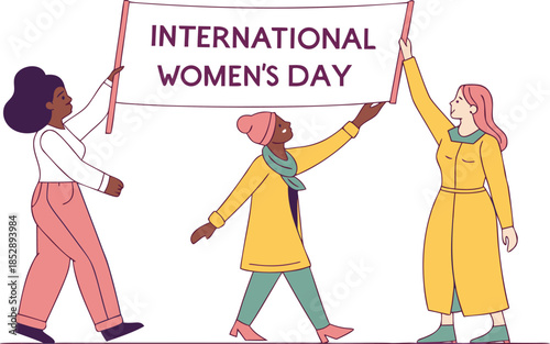 Две девушки-феминистки с плакатом равенства, поднятый кулак, плоская векторная иллюстрация. День равенства женщин, феминизм, сестринство.