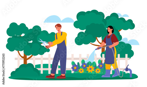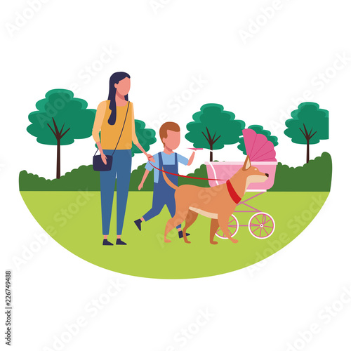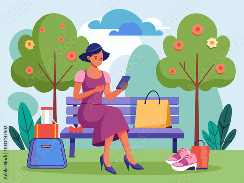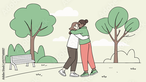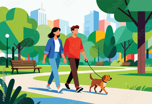 Две счастливые девушки делают селфи, плоская векторная иллюстрация. Молодые женщины, лучшие подруги, гуляющие в городском парке вместе с любимой собакой. Женская дружба.