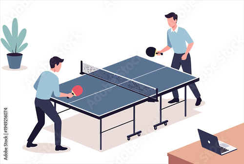 Два персонажа мужского пола играют в аркадную игру для настольного тенниса в пинг-понг, плоская векторная изометрическая иллюстрация. Игровой клуб, комната, зона аттракционов, веселые мероприятия, развлечения. Аркадные игры.