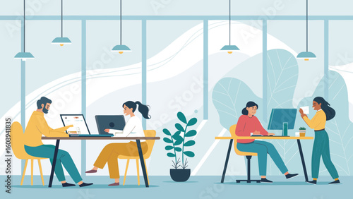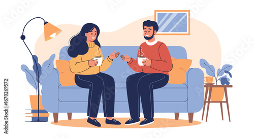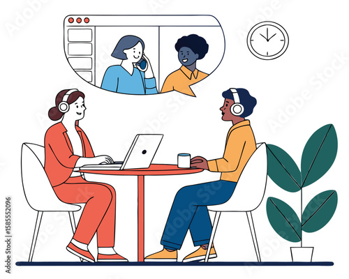 Два радиоведущих в наушниках разговаривают и записывают подкаст в студии. Векторная иллюстрация концепции подкаста и радиоинтервью. Прямая трансляция, аудиотрансляция, микрофон.