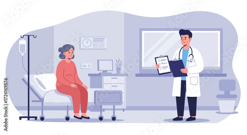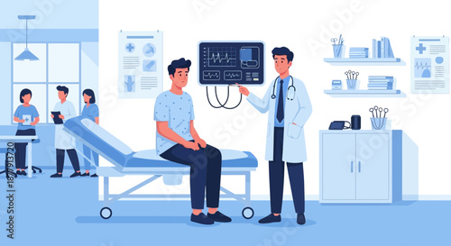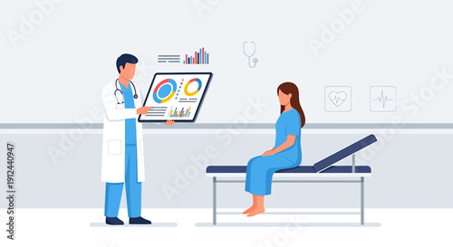 Лаборатория генетических наук. Два ученых мужского пола в лабораторных халатах изучают гены, структуру днк, плоскую векторную иллюстрацию. Биотехнология, генная инженерия, наука, медицина и технологии.