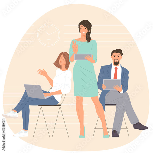 Набор типографских рабочих процессов, векторная иллюстрация. Оборудование типографии принтеры, чернила, палитра, мужские и женские персонажи, работники и клиенты. Услуги типографии, полиграфия для баннера, страницы сайта