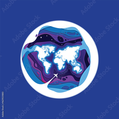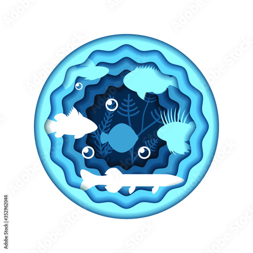 Векторная многослойная вырезанная из бумаги подводная морская пещера с водными растениями, экзотическими рыбами, медузами и коралловым рифом. Пейзаж океана или морского дна. Концепция красоты подводного мира в стиле бумажного искусства.