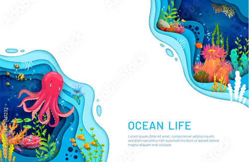 Векторный шаблон веб-сайта подводного мира, дизайн веб-страницы и целевой страницы для разработки веб-сайтов и мобильных сайтов. Вырезанная из бумаги подводная пещера, аквалангист, коралловый риф, рыба, акула, черепаха. Подводное плавание с аквалангом.