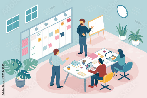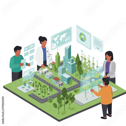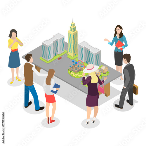 Вектор планирования городской территории. Группа архитекторов, инженеров работает над моделью мегаполиса с иллюстрацией здания небоскребов. Городское строительство, градостроительство и архитектура