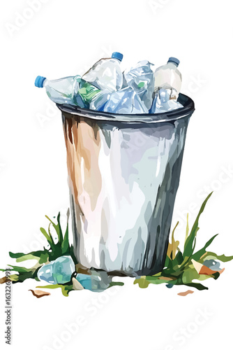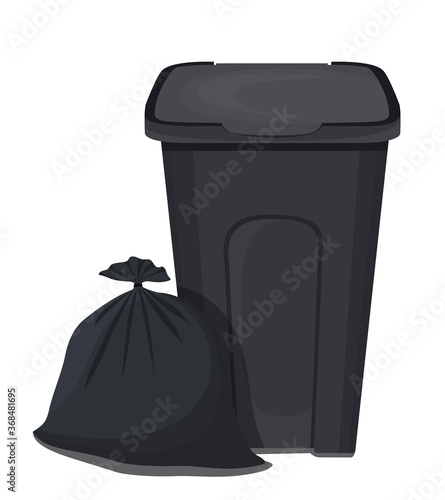 Использованные одноразовые медицинские маски для лица в пластиковых мешках для мусора, мусорное ведро и брошенные на землю, векторная иллюстрация. Загрязнение окружающей среды маскирует проблему экологии из-за пандемии коронавируса.