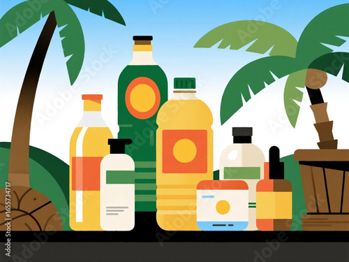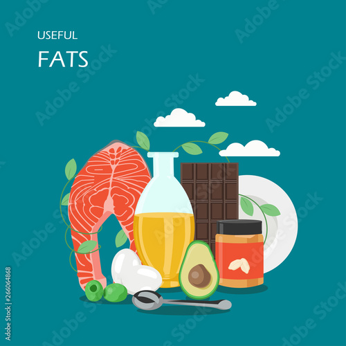 Иллюстрация дизайна в векторном плоском стиле полезных жиров. Авокадо, оливки, растительное масло, жирная рыба лосось, яйца, темный шоколад и арахисовое масло. Продукты со здоровыми жирами для веб-баннера, страницы веб-сайта и т.д.