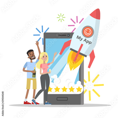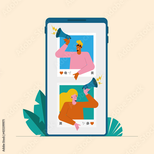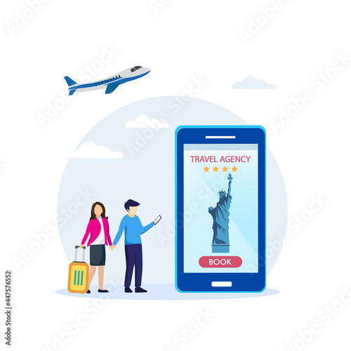 Привитая от Covid-19 пара путешественников смотрит на огромный смартфон с паспортом или сертификатом вакцины, плоская векторная иллюстрация. Цифровой дорожный сертификат covid.