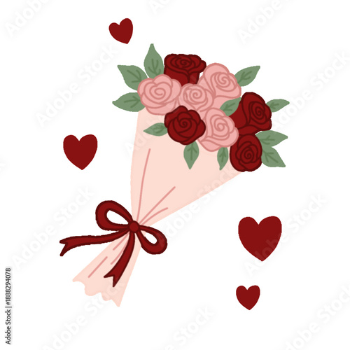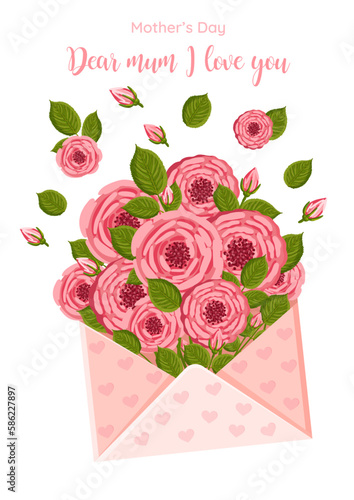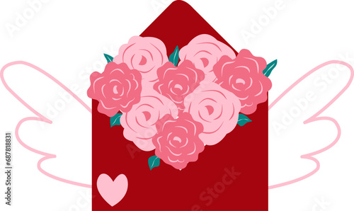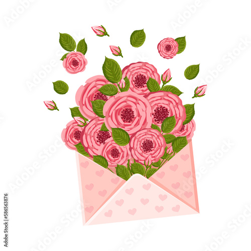Сердечки, розовые розы и птичка, вылетающая из конверта. Векторная поздравительная открытка на День Святого Валентина в стиле бумажного искусства.