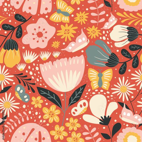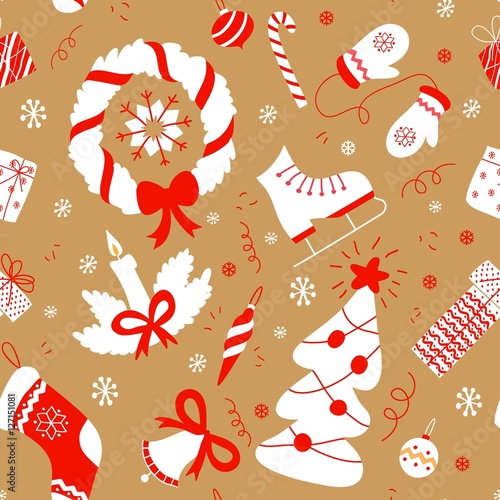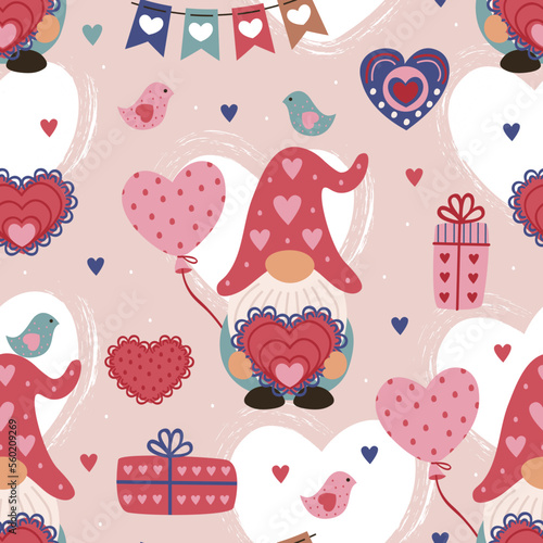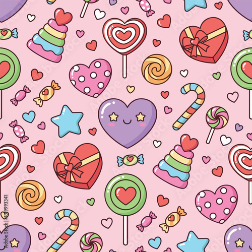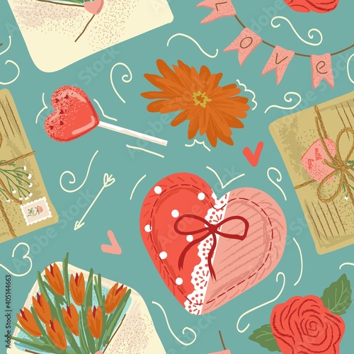 Бесшовный узор на день Святого Валентина, векторная иллюстрация. 14 Февраля День Святого Валентина дизайн декоративного фона с цветами, конфетами, письмом.