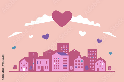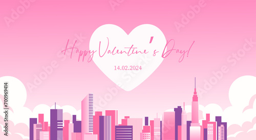 История в социальных сетях на День Святого Валентина, сообщение, векторный шаблон фоторамки. Большое вырезанное из слоистой бумаги сердце и воздушный шар с подарком, летящий над городом. Творческая композиция для плаката, баннера, обложки, открытки.