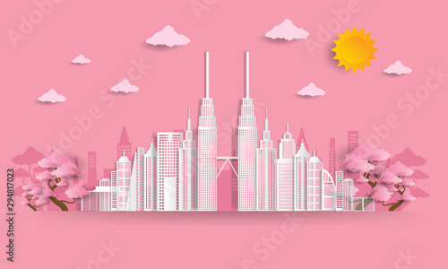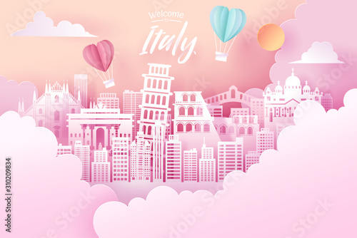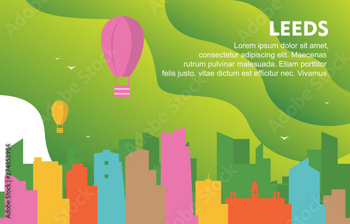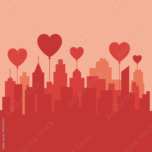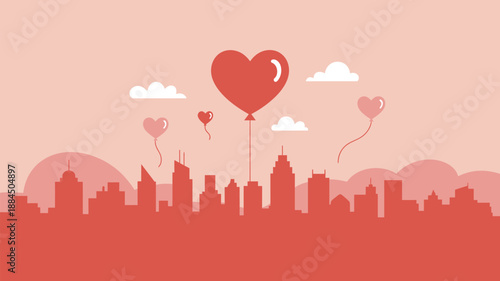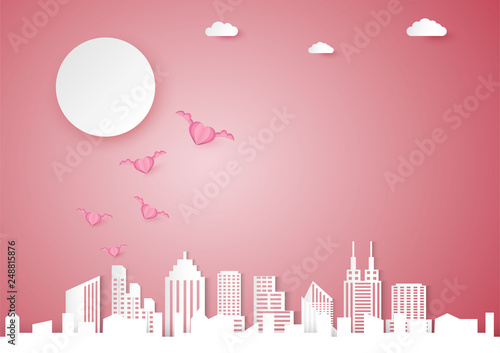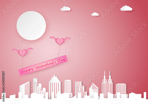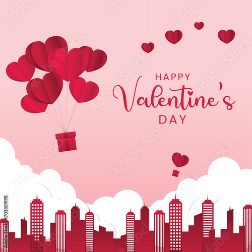 История в социальных сетях на День Святого Валентина, векторный шаблон для публикации. Вырезанный из бумаги воздушный шар в форме сердца с подарком летит высоко в небе над городом. Творческая композиция для плаката, баннера, обложки, открытки.