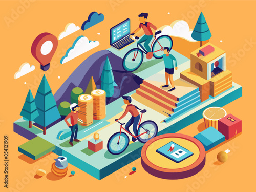 Векторная 3d-иллюстрация концепции магазина велосипедов с изометрическим видом в разрезе. Вырезанный интерьер магазина велосипедов с продавцом и покупателями.