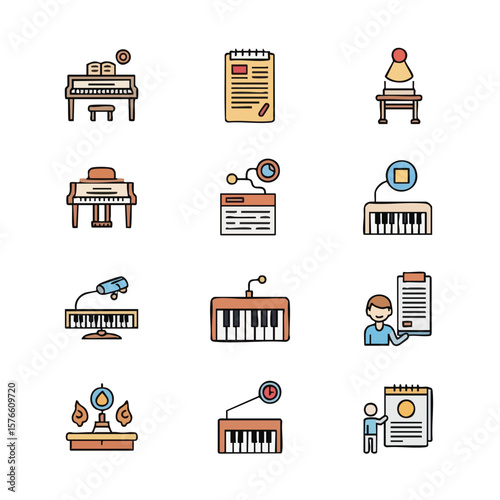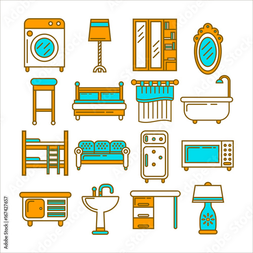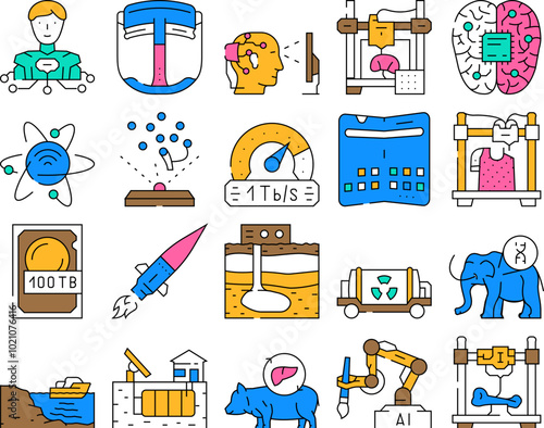 Набор значков векторного 3d-принтера с плоской тонкой линией. Элементы концептуального дизайна керамики, медицинских, пищевых технологий и технологий 3d-печати для дома, выделенные на белом фоне.