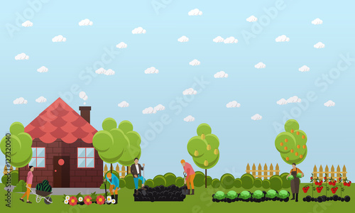 Садоводы собирают различные фрукты с фруктовых деревьев, апельсины, вишни, груши и упаковывают их в специальные ящики и корзины. Векторная иллюстрация в плоском дизайне