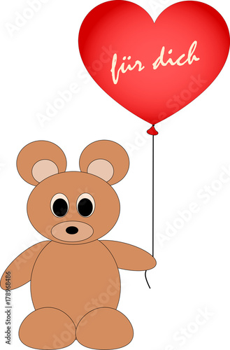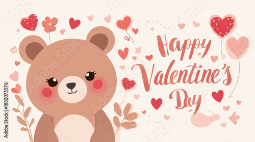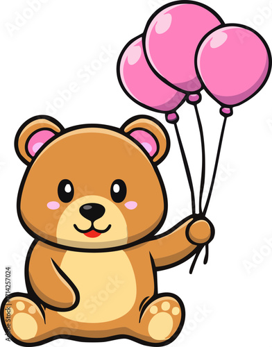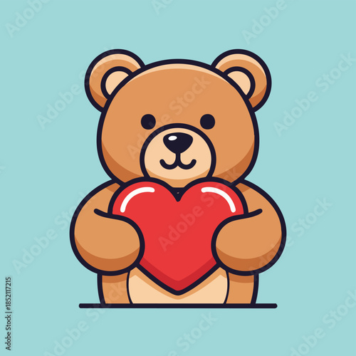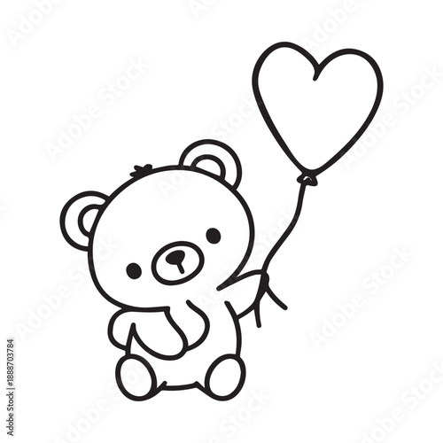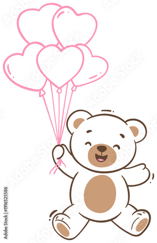 Животное в векторе любви. Плюшевый мишка с изображением воздушного шара в форме сердца. Милый счастливый персонаж для романтического оформления открыток на день святого Валентина, день рождения или свадьбу. Изолированный на белом фоне