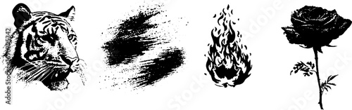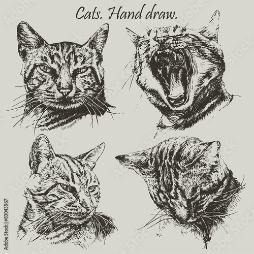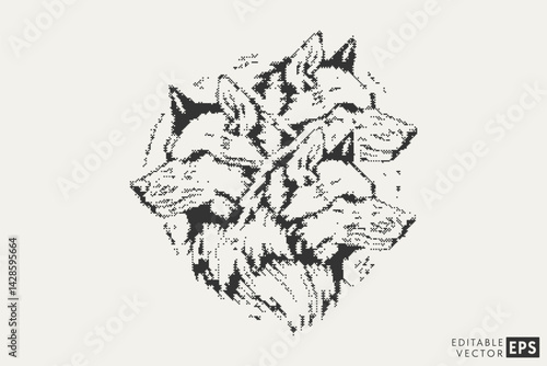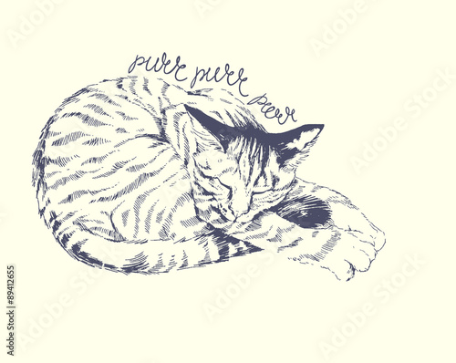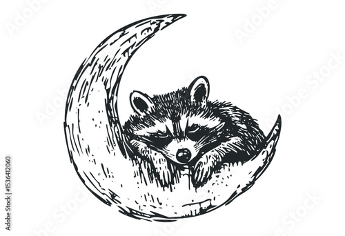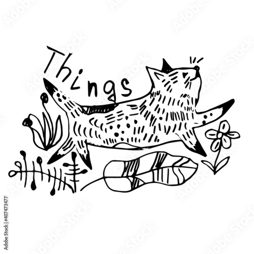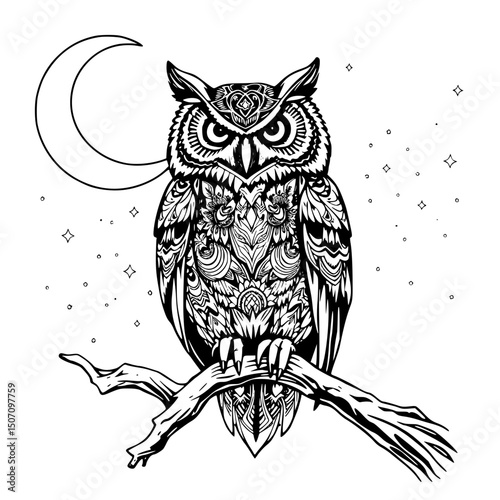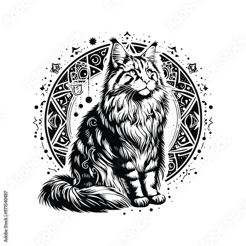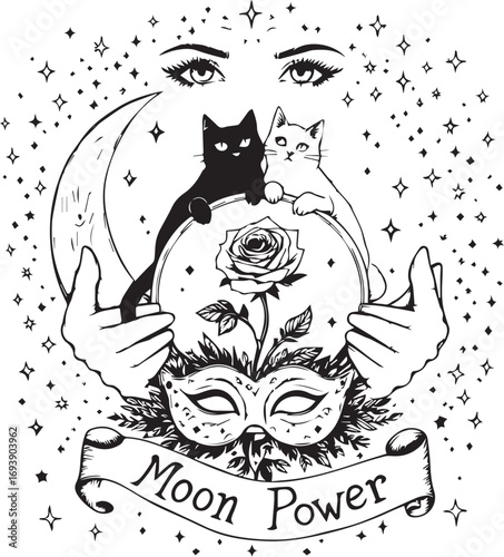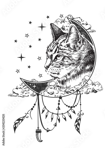 Векторная татуировка кота в стиле бохо или дизайн принта на футболке. Кошачья голова на полумесяце в сочетании с природой и элементами бохо.