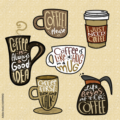 Векторный кофейный набор с написанными от руки вдохновляющими и забавными кофейными цитатами и высказываниями. Винтажный креативный типографский дизайн белого цвета на классной доске для кафе и печати.