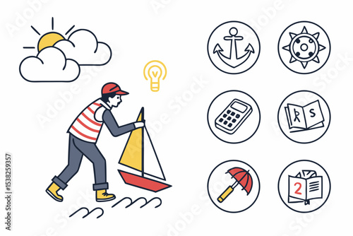 Векторная концептуальная иллюстрация на тему верховой езды с набором иконок, хлыстом, жокейскими ботинками, перчатками и шлемом, лошадью, седлом и снаряжением. Конный спорт. Плоский дизайн.