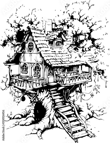 Художественный стиль татуировки орла. Векторный геометрический эскиз татуировки. Старинный нарисованный от руки орел, горы, лес.