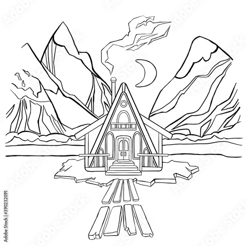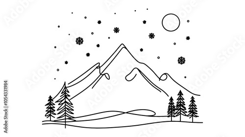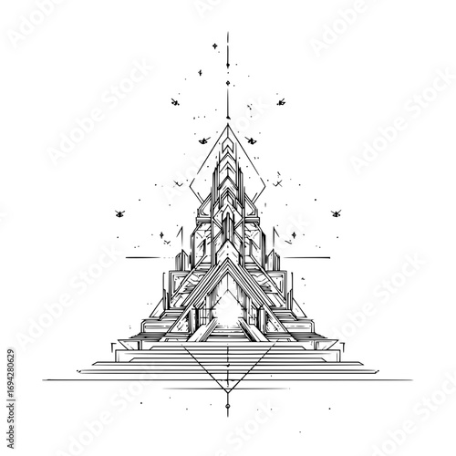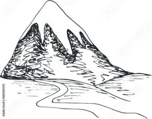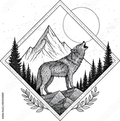 Художественный стиль татуировки тигра. Векторный геометрический эскиз татуировки. Винтажный нарисованный от руки тигр, горы, лес, звезда компаса, скрещенные стрелки.
