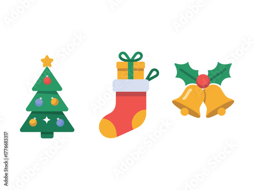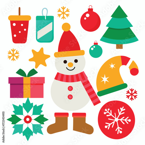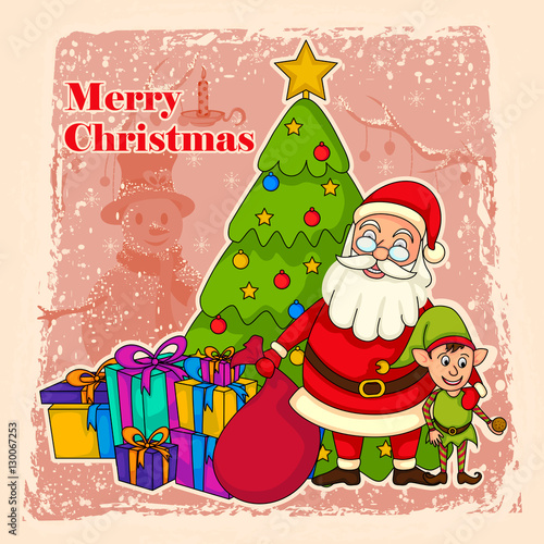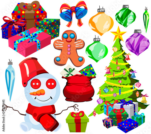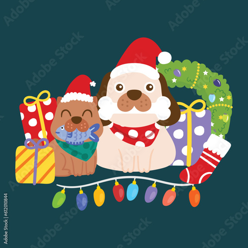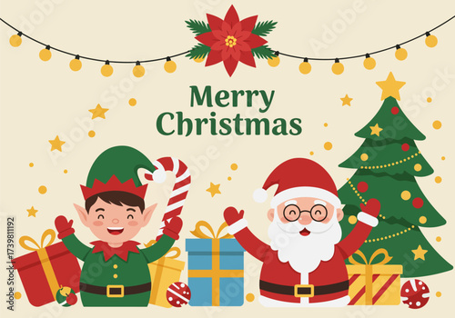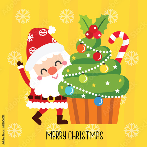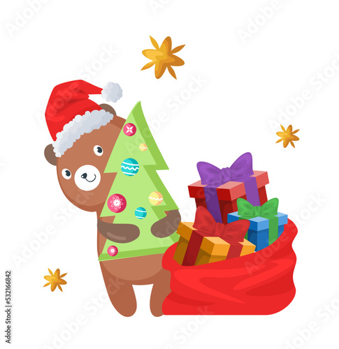 Векторная иллюстрация мультфильма с милым рождественским медведем. Дизайн поздравительной открытки с зимними праздниками для рождественского и новогоднего поздравления или приглашения. Маленькое существо с елкой и подарком, полным мешка