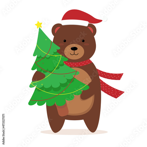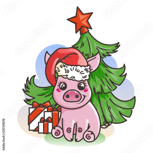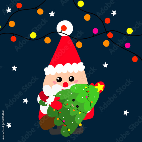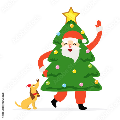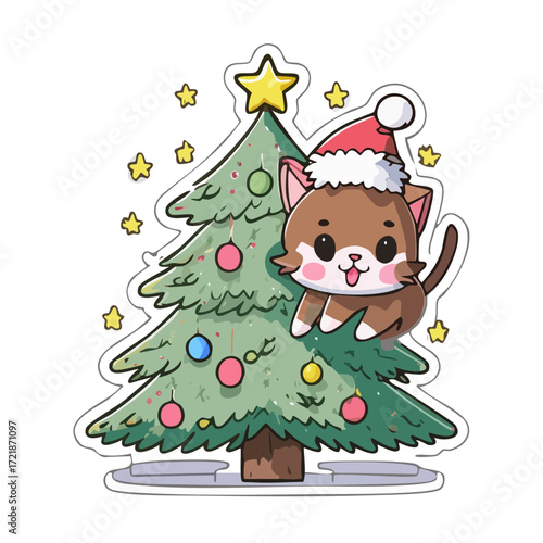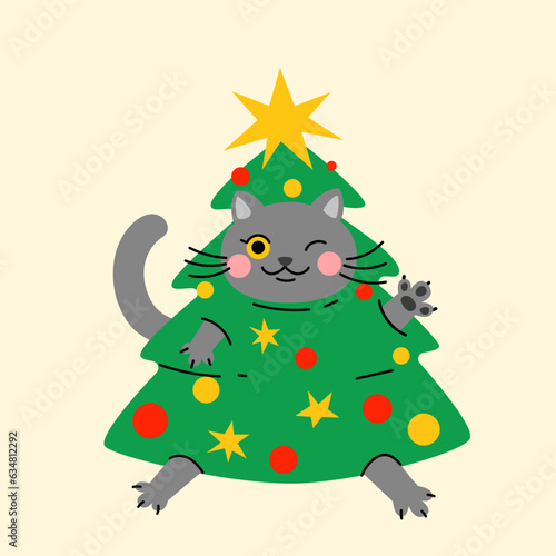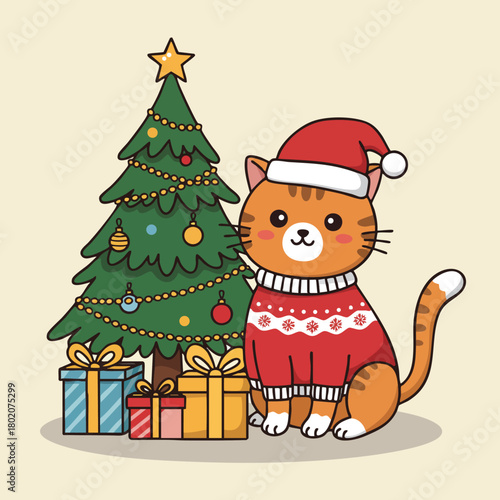 Векторный милый рождественский кот. Мультяшный персонаж - счастливое домашнее животное в шляпе Санты и рождественской гирляндой, стоящий возле украшенной ели. Поздравительная открытка к зимнему празднику