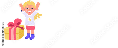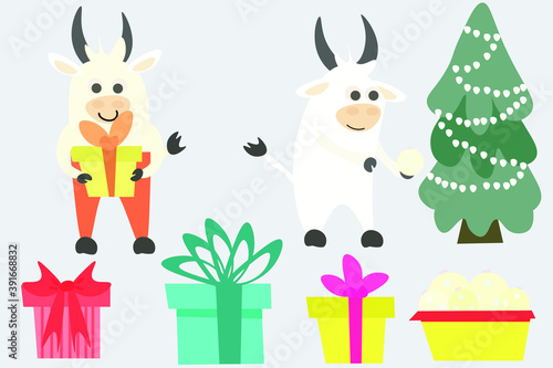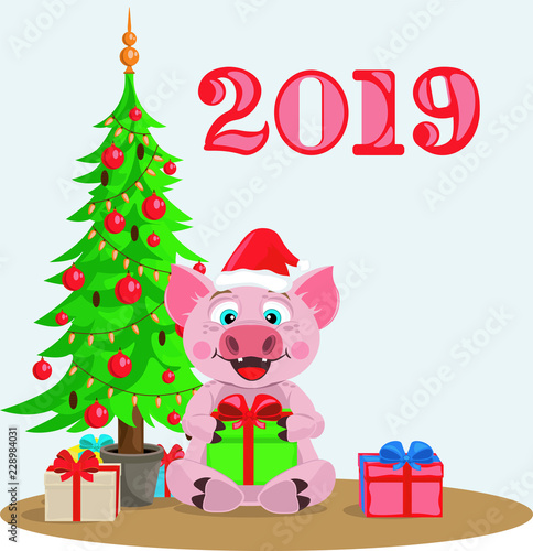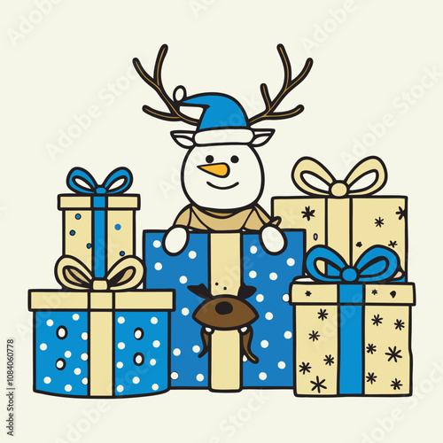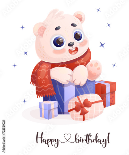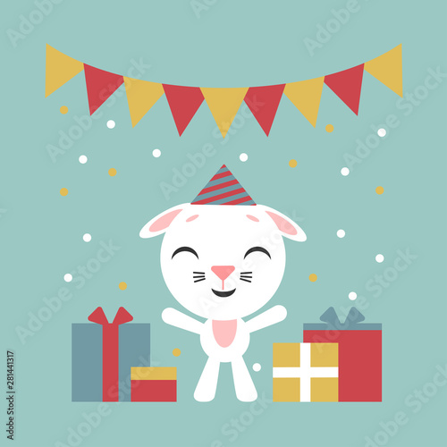 Векторный милый рождественский кролик. Мультяшная открытка со счастливым зимним персонажем. Счастливого празднования праздника. Поздравительная открытка на Рождество и новый год. Нарисованный заяц в гирлянде стоит рядом с подарочной коробкой