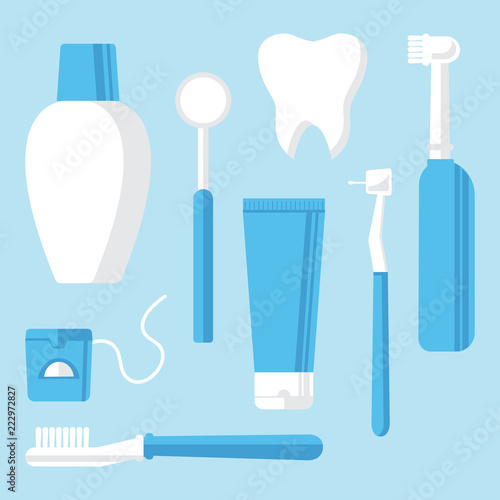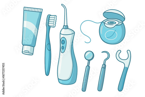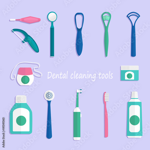Векторный набор инструментов для чистки зубов. Зубная паста, зубная щетка, жидкость для полоскания рта, зубная нить, скребок и зубочистка. Средства по уходу за полостью рта, набор для чистки зубов реалистичная иллюстрация.
