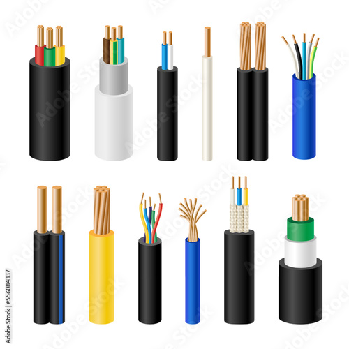 Набор векторных значков электрического кабеля. Электрические соединительные провода реалистичная иллюстрация, изолированная на белом фоне.