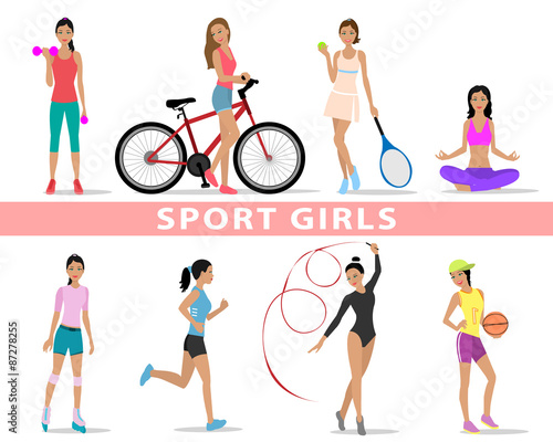 Векторный набор иконок фитнес-персонажей. Люди, занимающиеся йогой, тренирующиеся с гантелями, штангой и катающиеся на велосипедах. Элементы дизайна в плоском стиле, выделенные на белом фоне.