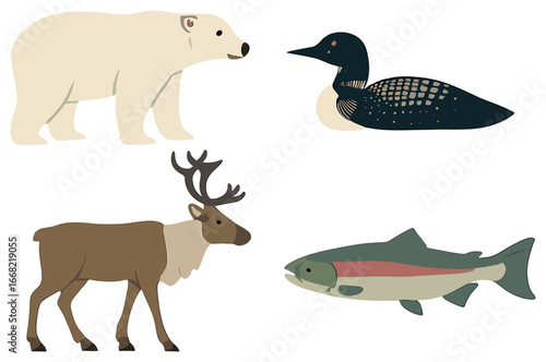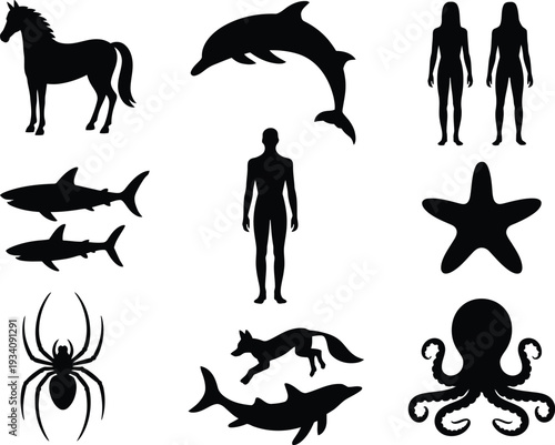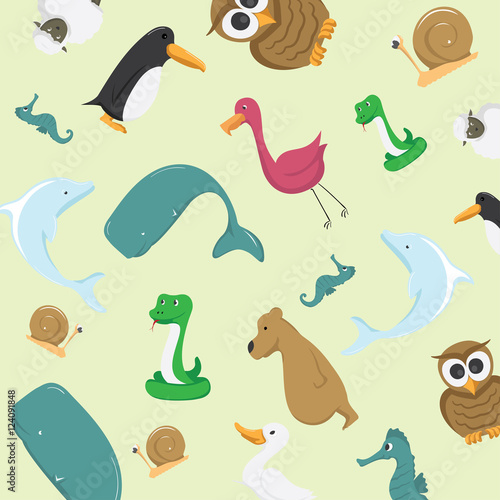 Набор векторных иконок мультяшных персонажей дельфинария, цирка и зоопарка, изолированных на белом фоне. Элементы дизайна в плоском стиле.