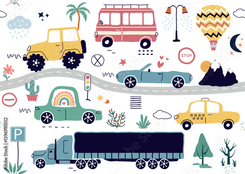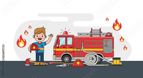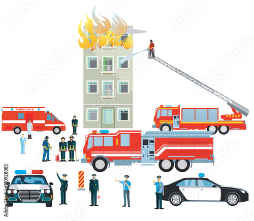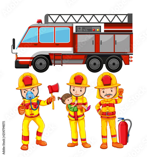 Набор векторных иконок людей профессии пожарного, изолированных на белом фоне. Пожарная машина, вертолет, пожарные, спасающие людей, лес, транспорт и дом от огня, элементы дизайна в плоском стиле.