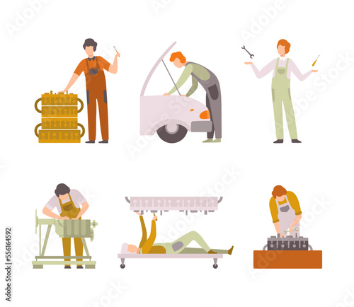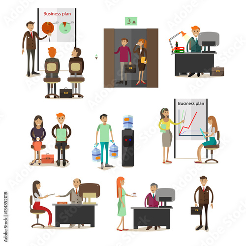 Набор векторных иконок ювелирного магазина, пекарни и интерьера мебельного магазина, покупателей и продавцов мультяшных персонажей, изолированных на белом фоне. Элементы дизайна в плоском стиле.