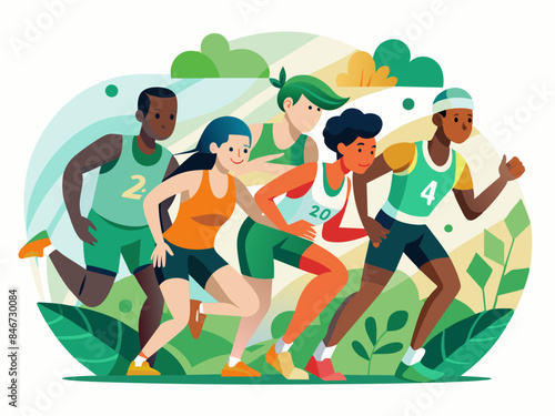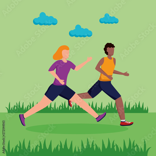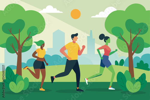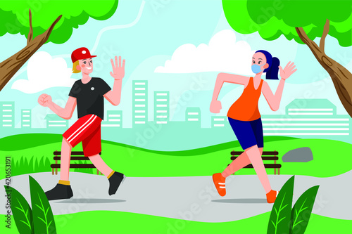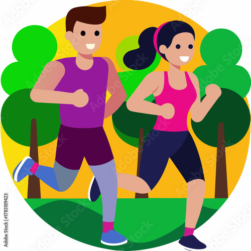 Векторная иллюстрация счастливой влюбленной пары, бегущей навстречу друг другу. Встреча влюбленных в парке элемент дизайна в стиле квартиры.