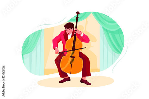 Векторная иллюстрация молодого музыканта, играющего на виолончели. Виолончелист, играющий классическую музыку, элемент дизайна в плоском стиле.