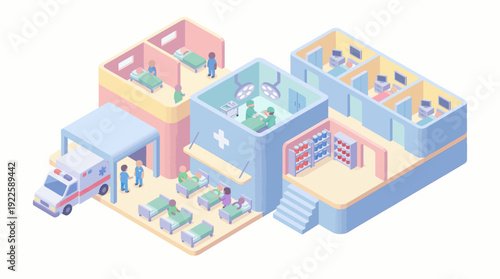 Векторный плоский изометрический город с аттракционами и общественными парковыми зонами. Карусель, средневековый замок, колесо обозрения, цирковая палатка, тир, бамперные автомобили, поездка на поезде, тележки с сахарной ватой и хот-догами.