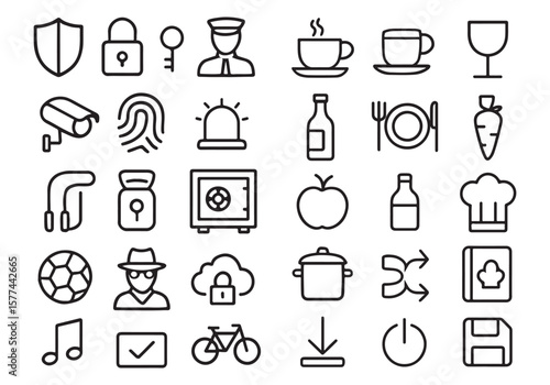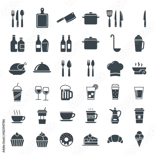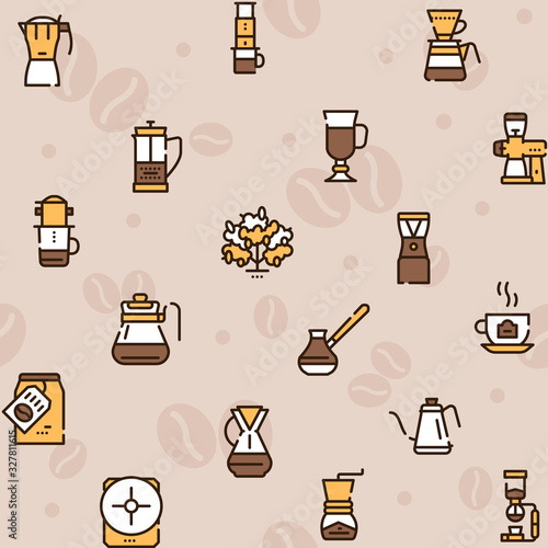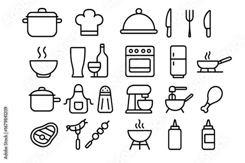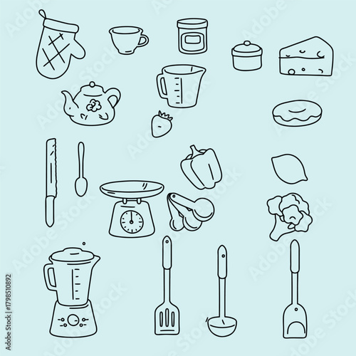 Векторный бесшовный узор с декоративными кухонными приборами и символами приготовления пищи, значками. Кухонный фон, текстура оберточной бумаги, тонкая линия, дизайн в плоском стиле.