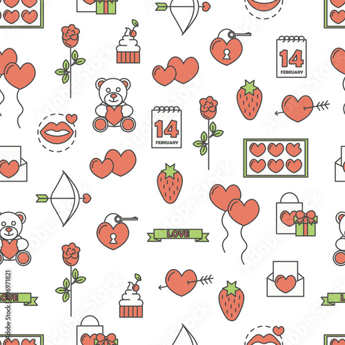 Векторный бесшовный узор с декоративными символами любви, значками. Любовный романтический фон, текстура оберточной бумаги, тонкая линия, дизайн в плоском стиле.