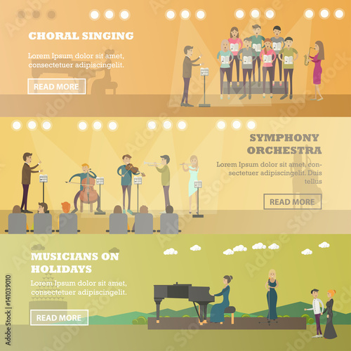 Векторный набор музыкальных горизонтальных баннеров. Хоровое пение, симфонический оркестр и музыканты на праздниках концептуальные элементы дизайна в плоском стиле.