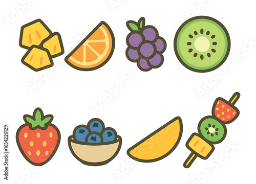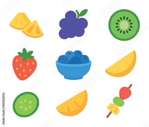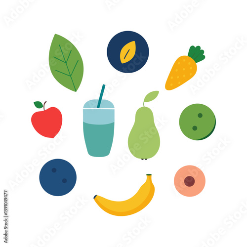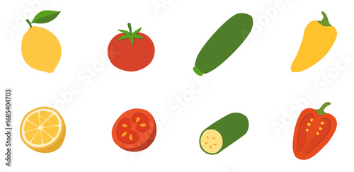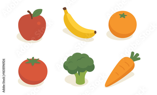 Векторный набор продуктов питания. Значок еды и питья на обед. Иллюстрация быстрого питания и здорового меню с фруктами и овощами для диетического завтрака. Тележка для покупок тележка для заказа, покупки и доставки продуктов