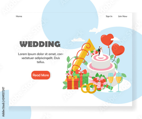 Шаблон целевой страницы Happy holidays. Векторная концепция дизайна в плоском стиле для веб-сайта агентства по организации вечеринок и торжеств и разработки мобильного сайта. Любовное событие, празднование годовщины свадьбы.